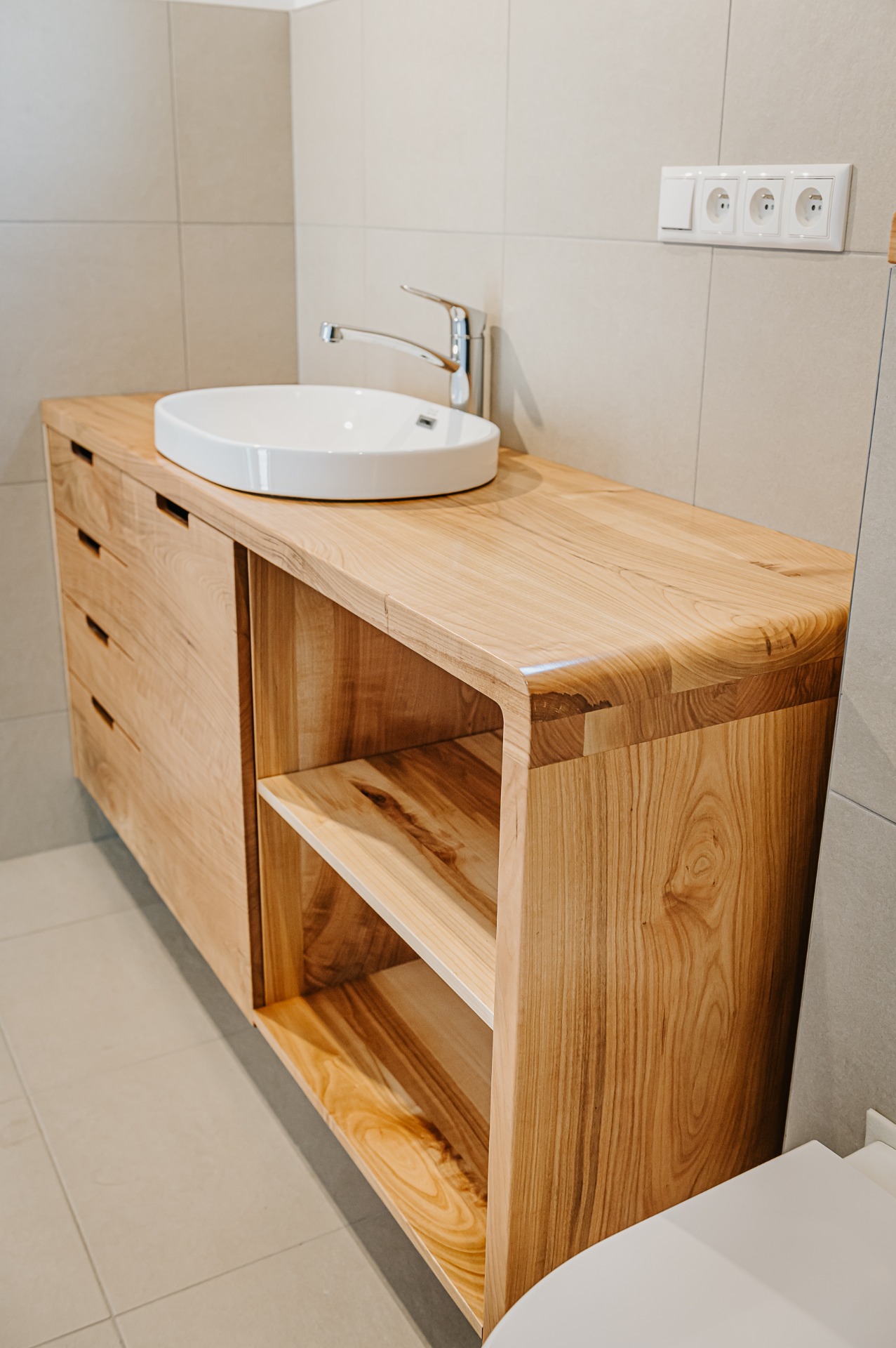 Povrchy komôd sú navrhnuté na jednoduchú údržbu – odolávajú striekajúcej vode, bežným čistiacim prostriedkom a nestrácajú farbu ani pri intenzívnom používaní. Prémiové lamináty, dyhy a lakované povrchy sú starostlivo zladené tak, aby pôsobili elegantne a zároveň prakticky v reálnych kúpeľňových podmienkach. Dôraz kladieme aj na detaily, ako sú ergonomické úchytky, precízne lícovanie dvierok a zásuviek či kvalitné hrany, ktoré bránia prenikaniu vlhkosti do materiálu.